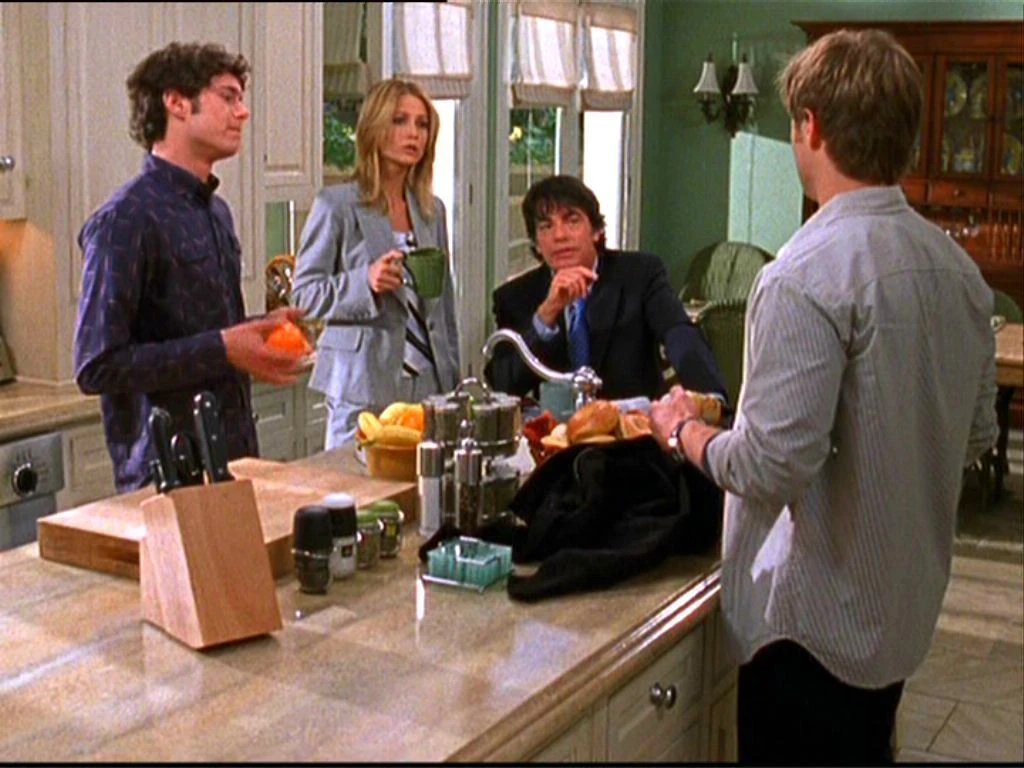 Sandy and Kirsten are in the kitchen when they say hi to Marissa who leaves quickly. Theresa walks in as well and leaves quickly. Ryan and Seth walk in after and Kirsten talks to Ryan about Marissa and Theresa stopping by. Kirsten asks if Theresa is staying and Seth says that she is. Sandy and Kirsten continue to ask questions and Seth answers most of them. Kirsten asks how long Theresa is staying and Ryan finally says that they are figuring it all out. Sandy then starts asking all the important questions that Seth asked earlier, getting him to think about how Theresa would even be able to stay in Newport. Kirsten chimes in as well when Ryan starts dodging the questions. Ryan leaves for school and Seth asks for a ride from Kirsten. She asks Sandy before she leaves if he is going to take the case. Kirsten wants to host the party for Caleb's award for Man of the Year by Riviera and Sandy tells her he is thinking about it.