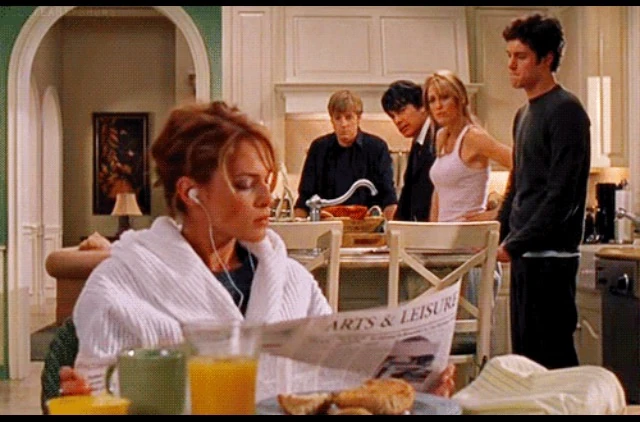 Hailey is listening to Saturday Morning by The Eels as the Cohens stumble into the kitchen one by one trying to find something to eat for breakfast. Hailey's ate the last of the bagels, drank most of the orange juice, and hoards the newspaper, all to the Cohens dislike. Sandy is pressed and Seth and Ryan back him up while Kirsten tries to defend Hailey's situation. Hailey calls for Kirsten to make her more coffee and the boys try to keep her from attending to her needs. Kirsten says she will talk to her. Ryan is packing his bag for school when Seth comes in asking to talk to him. Seth voices how Marissa is always around Ryan and he is in desperate need of Seth/Ryan time. Seth says that Ryan is whipped and he denies it and offers to talk to him then. Seth tries to explain his dilemma with Anna and Summer since he is now dating Anna and needs to tell Summer. Seth starts telling him how he doesn't want to hurt Summer's feelings when Marissa walks in. She says hi and gives Ryan a kiss and asks them what they are talking about. Seth tells her "guy stuff" and rushes them out. Seth pleads with Ryan to finish their chat later when Ryan says yes and that he just needs to check with Marissa.